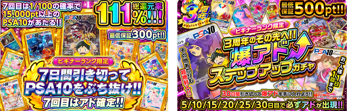 | 821pt | 50,000口 | 1/1.821の確率で1,111pt以上、プチュン演出発生で福袋orPSA10当選 |