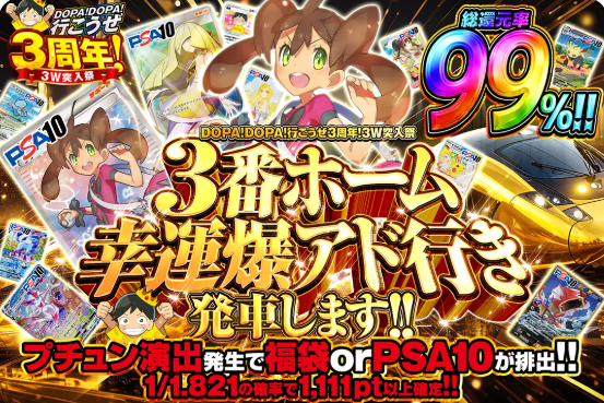 確率55%程度でアド、さらに特定の演出が発生するとDOPAオリパの福袋またなPSA10が当選。