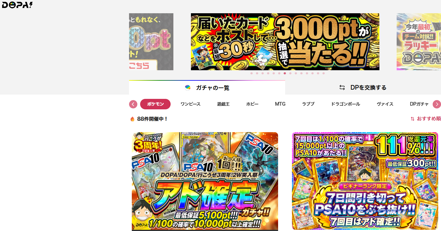 DOPAオリパは、ポケカを中心にワンピース・遊戯王・MTGなど幅広いタイトルを扱うオンラインオリパサイトです。価格帯は1ptから高額帯まで幅があり、支払い方法も非常に豊富。