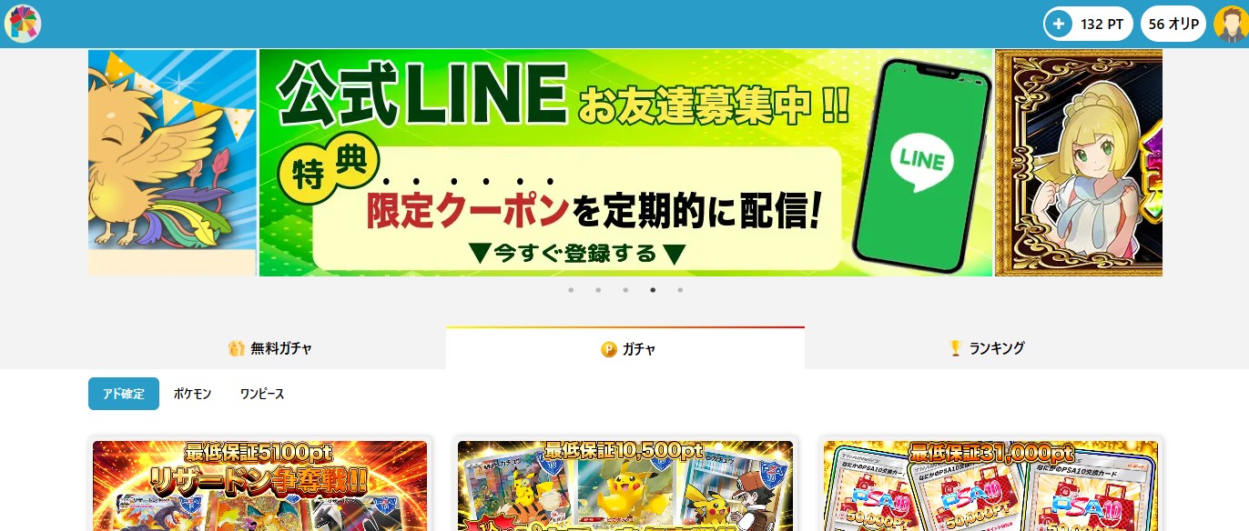 特徴 高額当たりを狙える“夢重視”のガチャ構成 1口1円から引ける豊富なオリパを展開。透明性のある表記や迅速発送にも注力 低価格から高額まで幅広い価格帯のオリパがあり、演出や還元率もユーザー評価が高い 高還元率ガチャや限定キャンペーンが豊富 初回無料の「ばら撒きガチャ」やログインボーナスがあり、無課金状態でも楽しめる