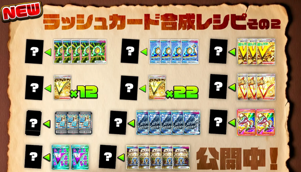初代Vラッシュに続いて新登場したVラッシュや新機能Ωラッシュ、倍々チャレンジも合成レシピに登場!