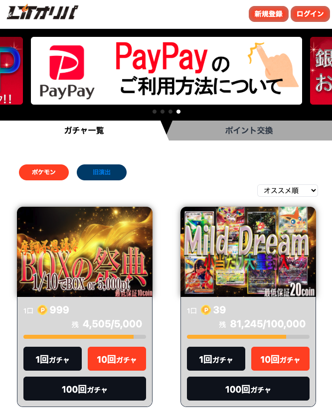 特徴 穴場感がある、シンプルなサイト、ログインボーナス 1口1円から引ける豊富なオリパを展開。透明性のある表記や迅速発送にも注力 無料ポイントやデイリーオリパなど初心者でも遊びやすい仕組み 低価格から高額まで幅広い価格帯のオリパがあり、演出や還元率もユーザー評価が高い 高還元率ガチャや限定キャンペーンが豊富 初回無料の「ばら撒きガチャ」など無課金でも楽しめる