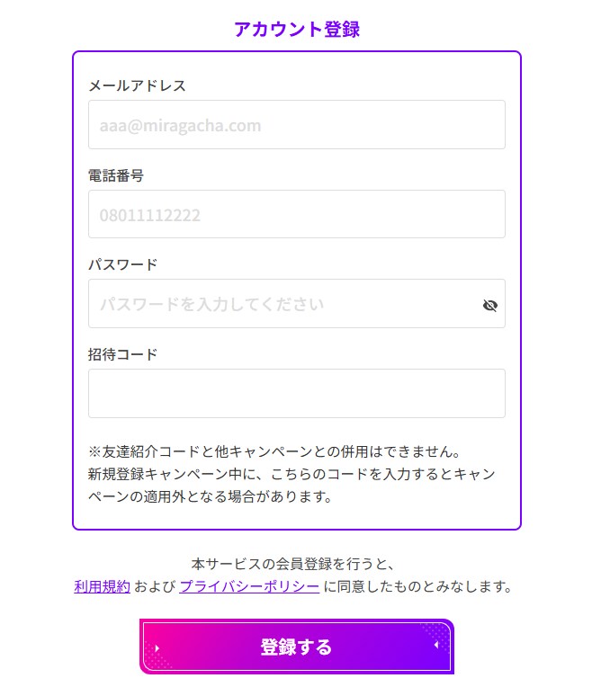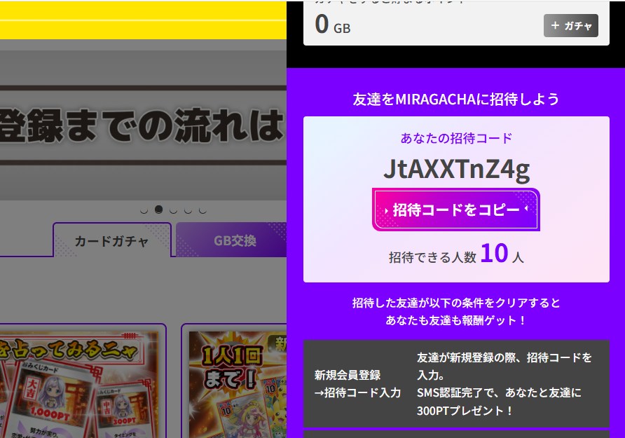 MIRAGACHA招待コードとは、新規登録時に入力するとあなたと友達の両方にポイントが付与される紹介キャンペーン用コードです。