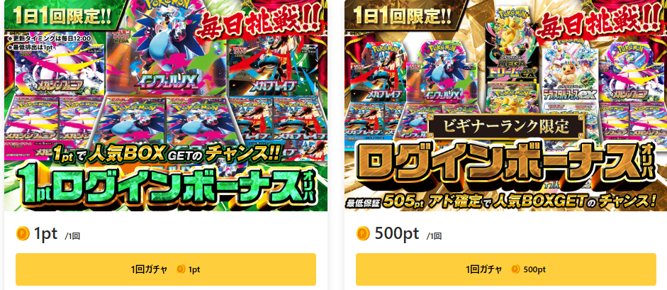 低価格帯のオリパが多く、少ないポイントでも回数を増やしやすい設計になっています。ログインボーナスやイベント配布もあり、無料でも継続して楽しみやすいのが魅力的!