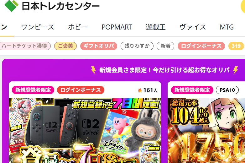 日本トレカセンターは初回特典のバランスが良く、無料で始めやすいオンラインオリパの定番サイトです。