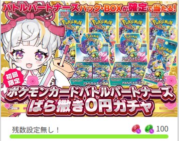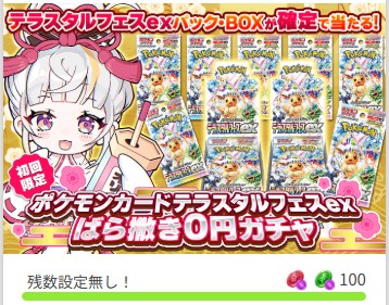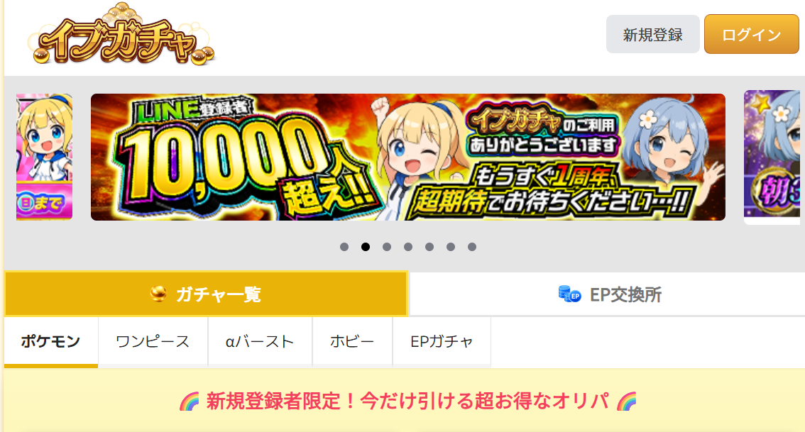 | イブガチャ | 新規登録後に時間限定で引けるオリパ | コード入力で100pt、累計10,000円購入で500pt | 完全無料で100連引けるオリパ | 18pt~引けるオリパ複数 | 100回程度 |