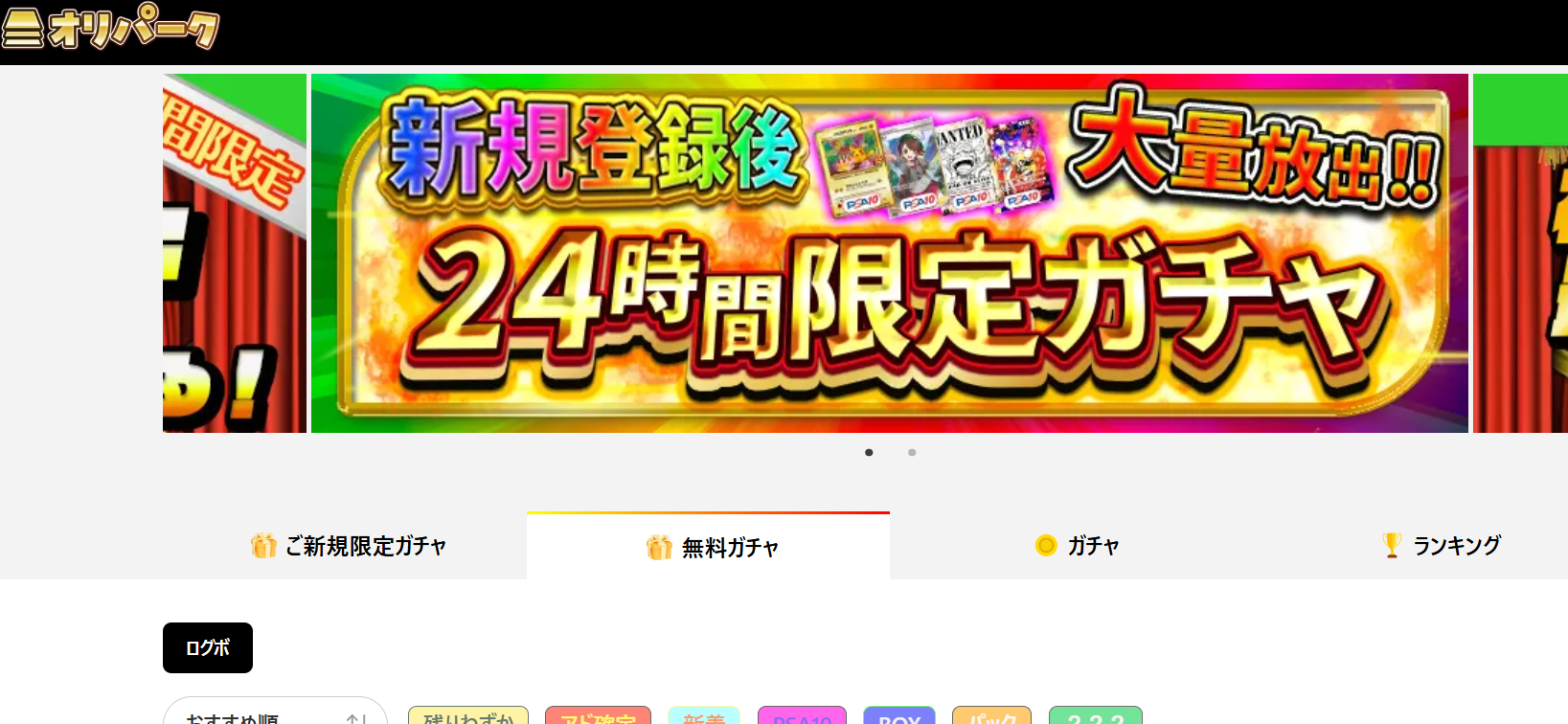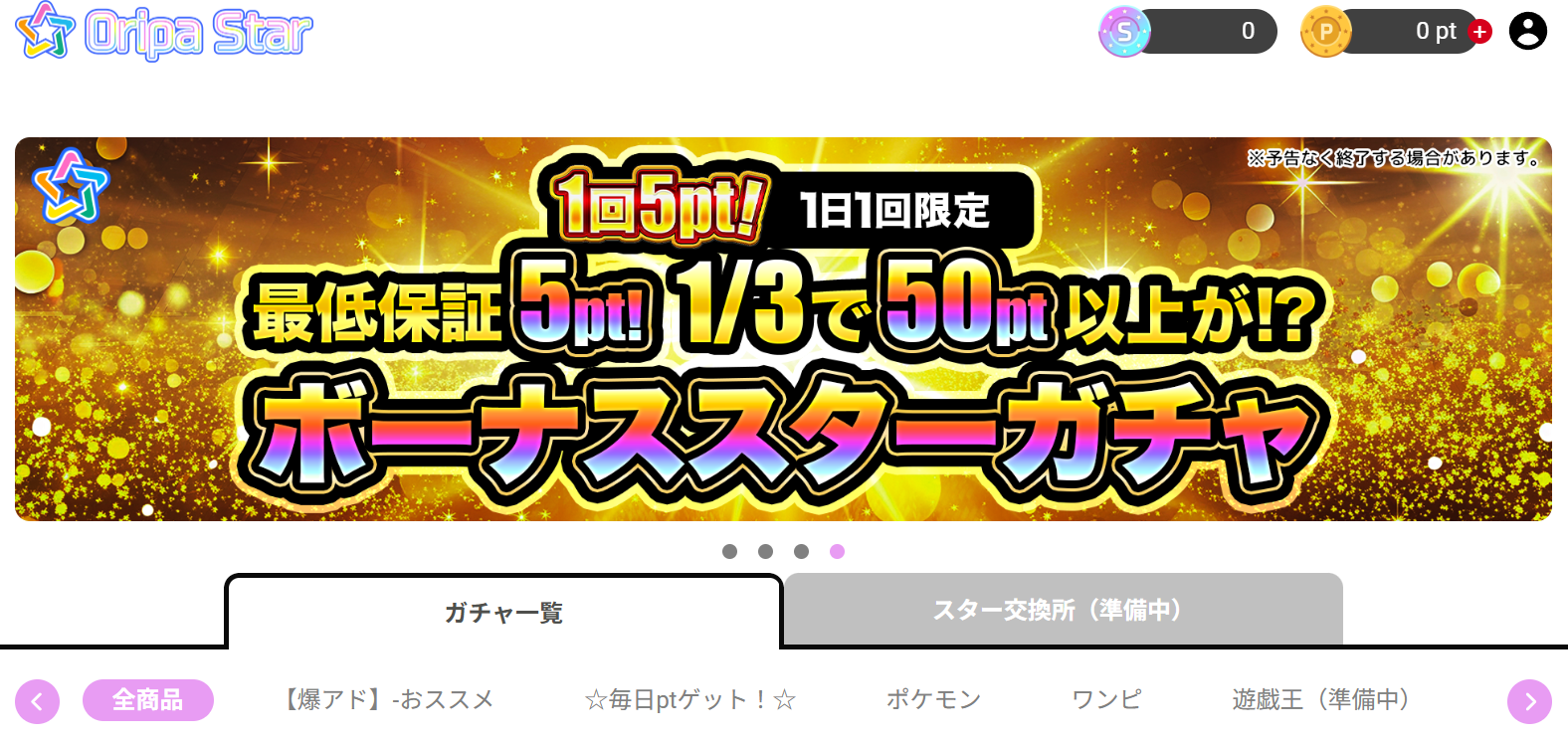 | オリパスター | なし | なし | 1日1回引けるアド確定ガチャ | 50pt~引けるオリパ複数 | 1日1回 |