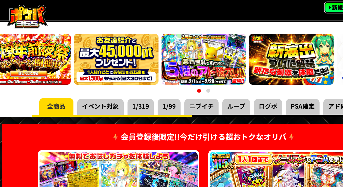 | ポケパ365 | ハイクラスパック1つ無料 | 招待コード入力で最大1,500pt | アド確定ガチャ多数 | 12pt~引けるオリパ複数 | 10~100回程度 |