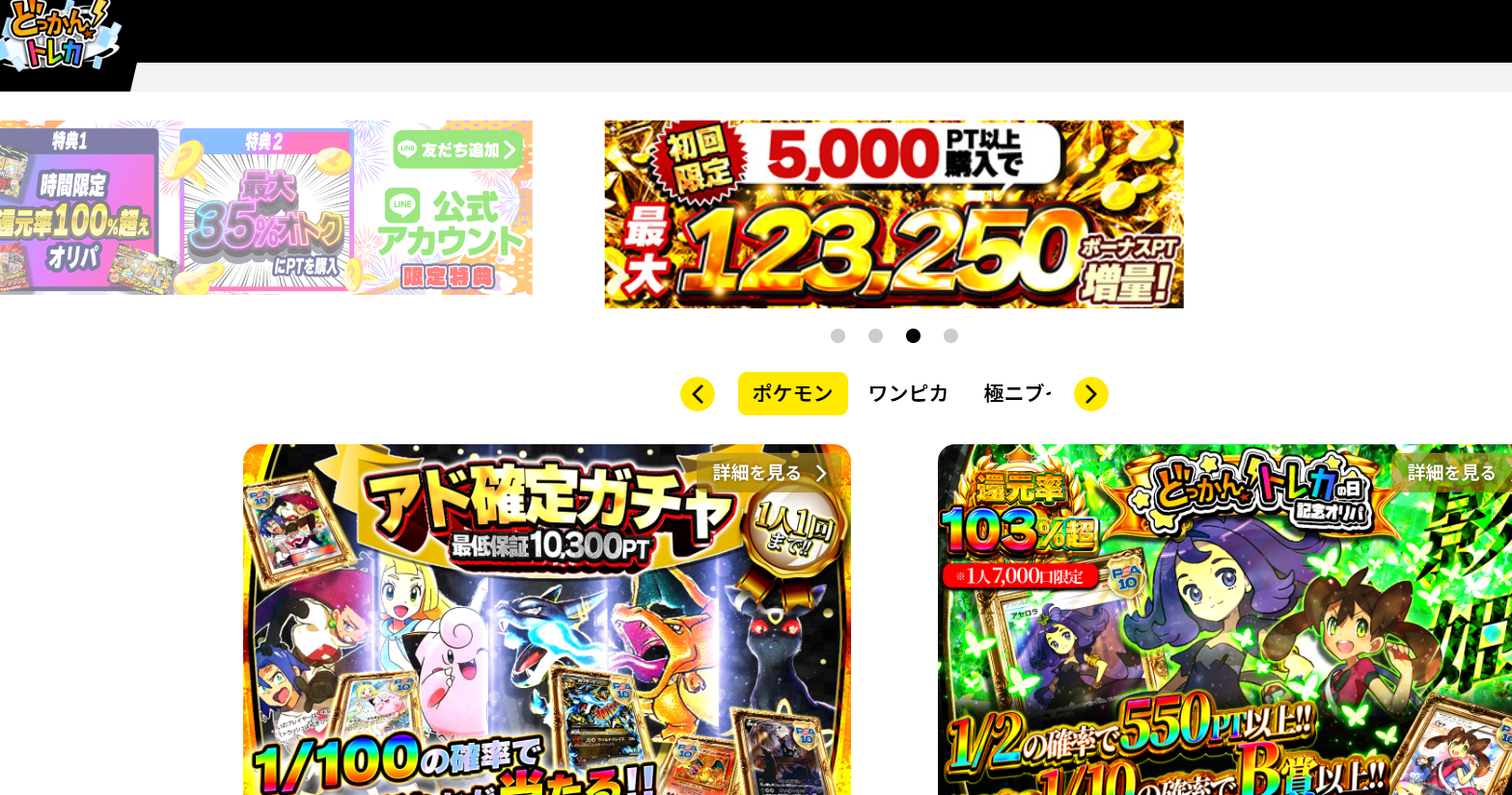| どっかん!トレカ | 初回5,000pt以上購入で最大123,250ボーナスポイント | なし | 1人1回引けるアド確定ガチャ | 10pt~引けるオリパ複数 | LINEクーポン+購入特典活用で100回~ |