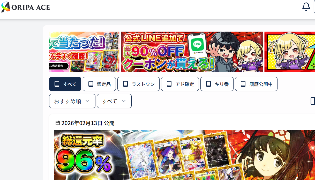 | オリパエース | 公式LINE追加でクーポン配布 | コード入力で300pt | アド確定ガチャ多数、VIP加入で発送ごとに無料プレゼント | 10pt~引けるオリパ複数 | 1~30回程度 |
