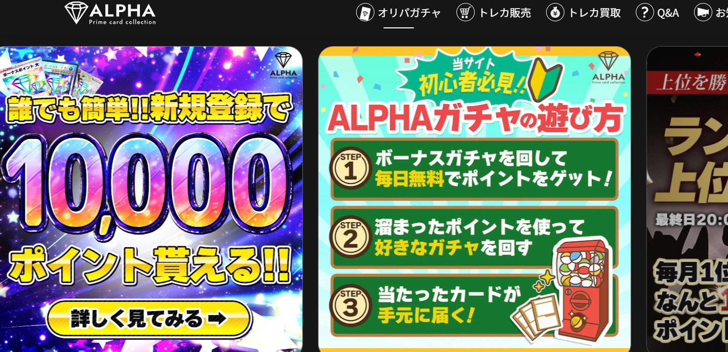 | カードショップALPHA | 公式LINE追加で500pt、登録1週間以内に1,000pt以上購入で500pt | コード入力で500pt以上課金で500円分のポイント | 最大10,000pt当たる完全無料ガチャ | 少なめ | 1~3回程度 |