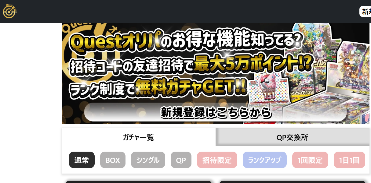 | Questオリパ | なし(キャンペーン終了) | 実質無料で引ける招待限定オリパ | ガチャを回して貯まるQPで無料交換 | 60pt~引けるオリパ複数 | 1~10回 |