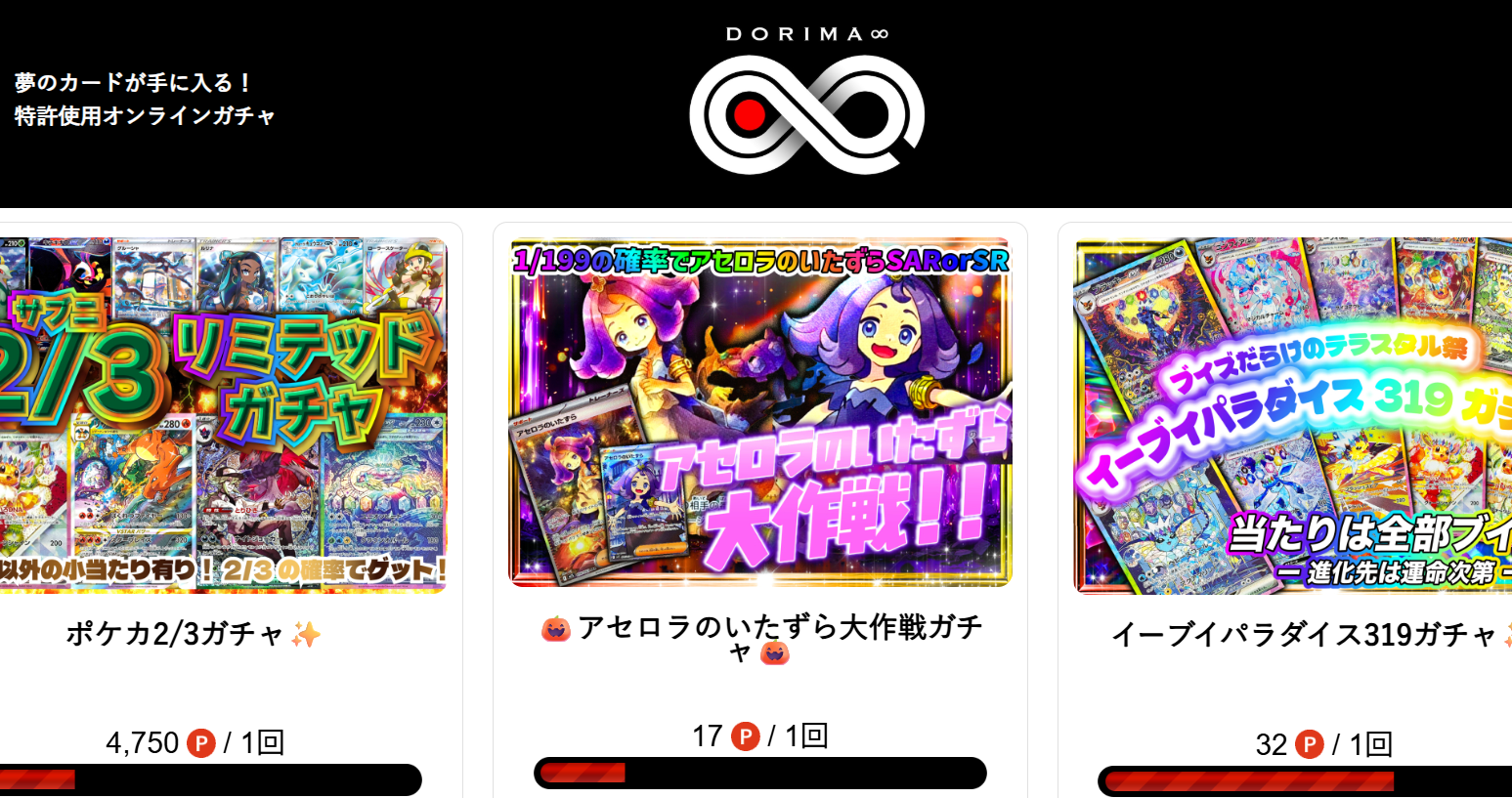 | DORIMA∞ | なし | コード入力で500PとSMS認証で500P | なし | 17pt~引けるガチャ複数 | 50~80回程度 |