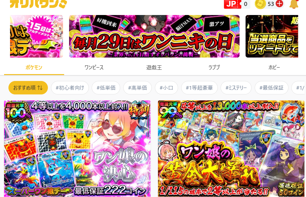 オリパワンは、新規登録特典やジャックポット機能など無料要素が充実しているオンラインオリパです。