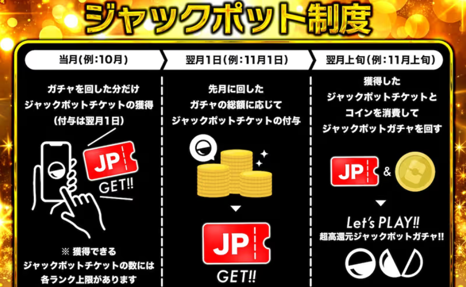 ガチャを引くごとにジャックポットゲージが貯まり、その総額に応じて翌月の1日にJPチケットが付与されます。
