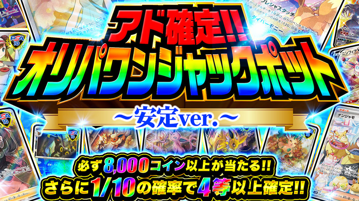 ジャックポットガチャは、オリパを一定数引いていくともらえるJPチケット+コインで引くことができるアド確定かつ激アツなお祭りオリパ。