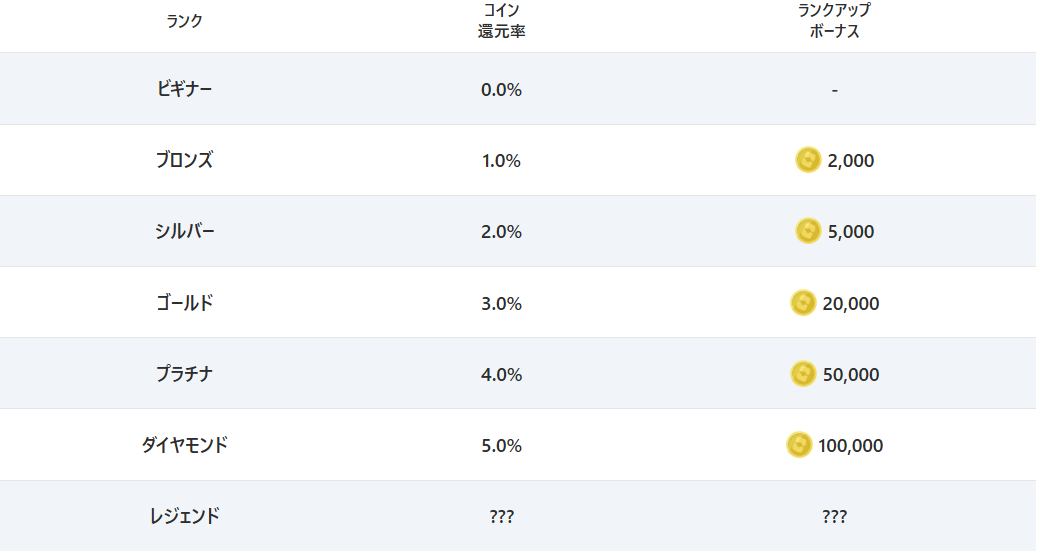 オリパワンでは、会員ランクが上がるごとにボーナスコインが付与されます。