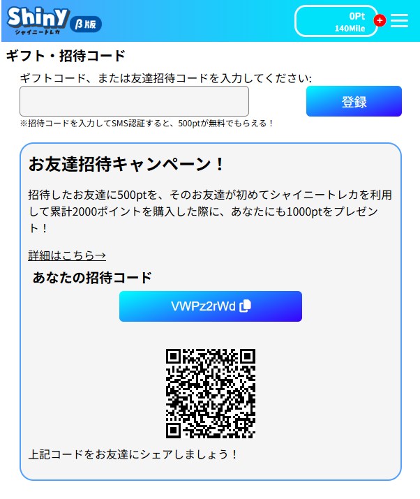 シャイニートレカの招待コードとは、新規登録時に入力するとポイントがもらえる紹介キャンペーンです。