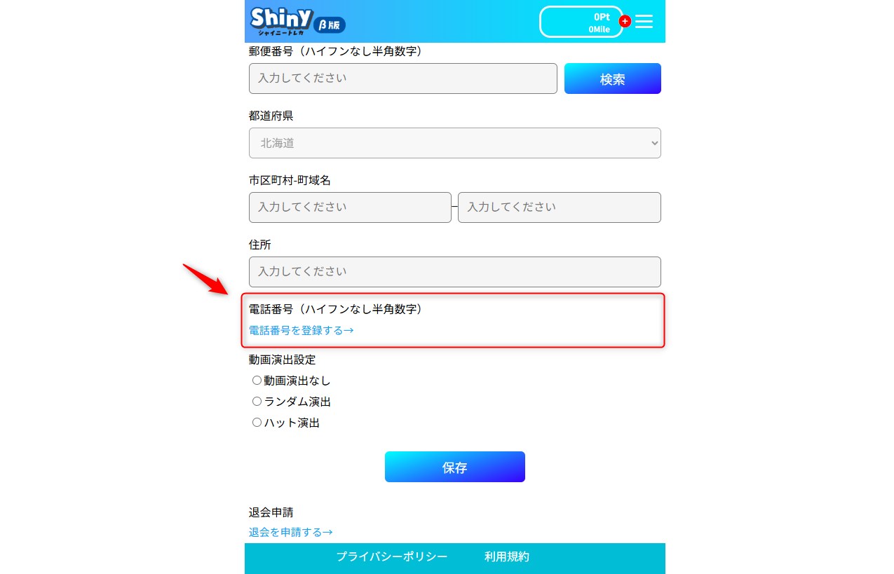 ログイン後マイページー「電話番号を登録する」からSMS認証を行うとポイントが付与されます。
