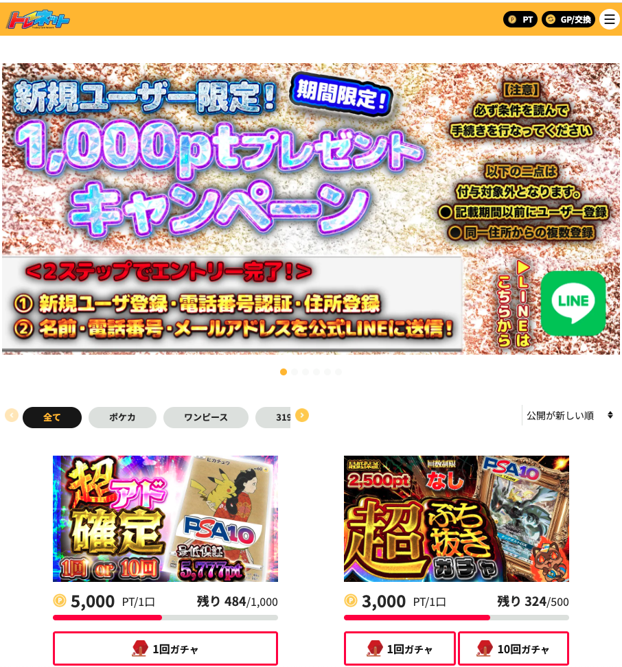 多くのサイトが最低でも1口100pt〜300pt程度であるのに対し、トレネットは1口15ptや64ptといった超低額ガチャを用意しています。これにより、「課金するほどじゃないけど、ちょっと運試ししたい」というニーズに見事に応えています。