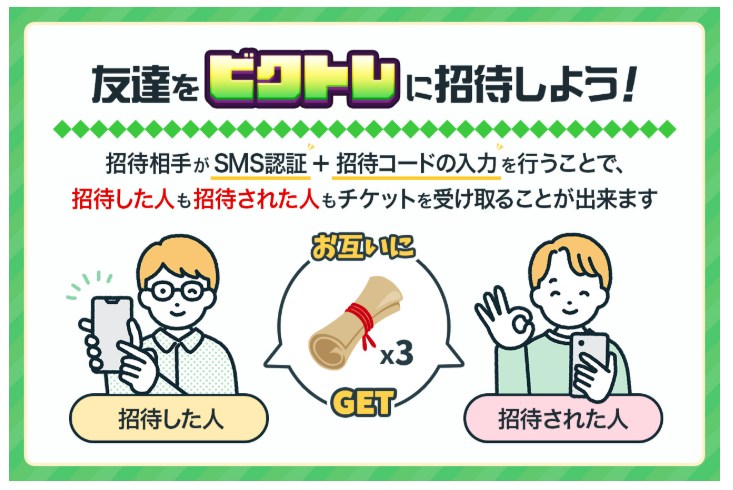 ビクトレでは、招待コード入力でチケット3枚が受け取れます。