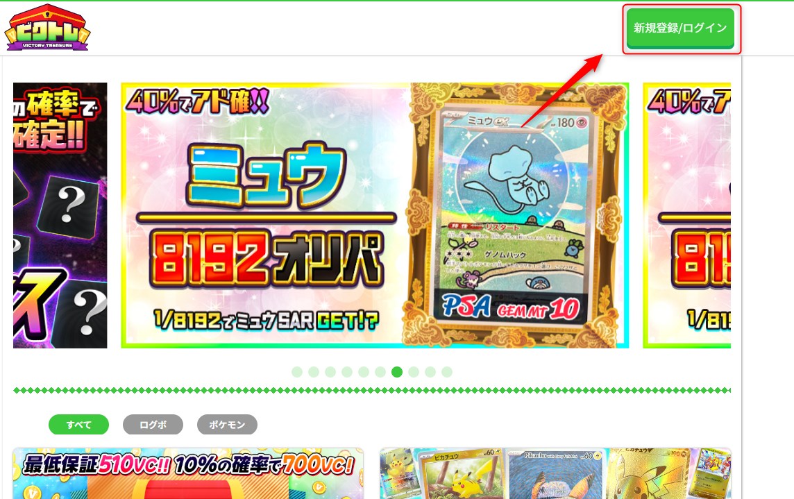 ビクトレ公式サイトにアクセスし、「新規登録/ログイン」ボタンをタップ/クリックします。