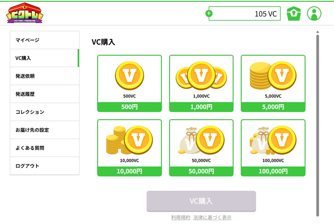 ログイン後、チャージボタンもしくはマイページ「VC購入」から購入画面に移動して希望の金額を選択します。