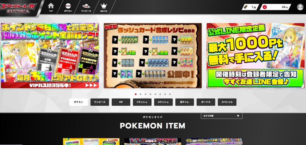 エクストレカは、ポケカとワンピース2つのジャンルで構成されたオリパサイト。
